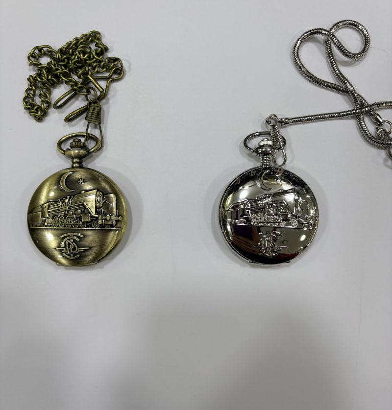 DEVLET DEMİRYOLLARI TEMALI KÖSTEKLİ CEP SAATİ , ARKA YÜZÜ LAZER YAZIYA UYGUN PARLAK DÜZ ZEMİNLİDİR.
