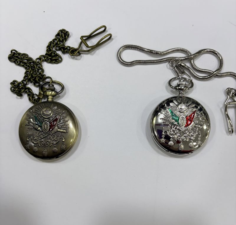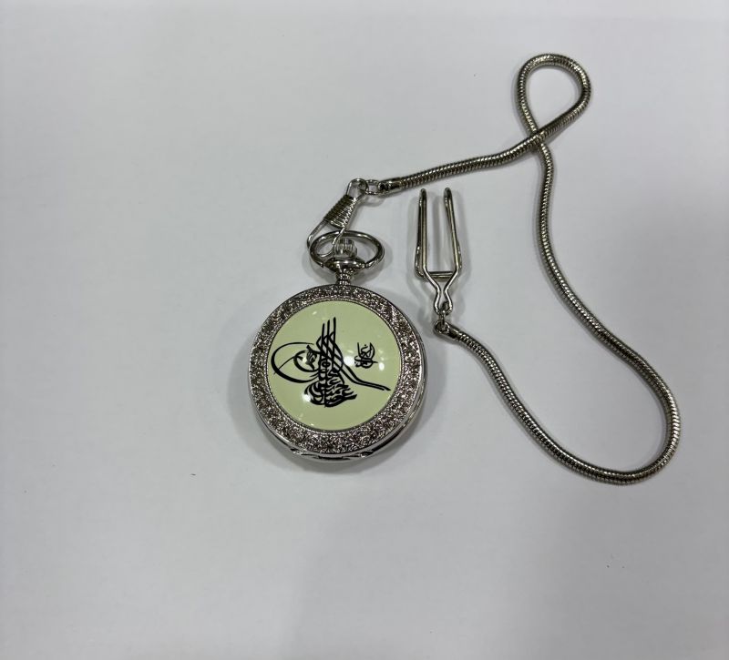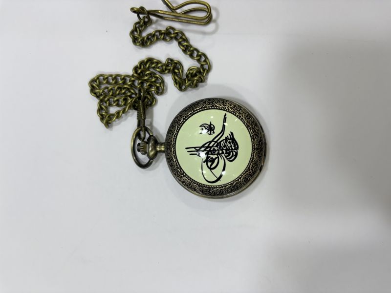 ÖN YÜZ OSMANLI DESENLİ , ARKA YÜZ DESENSİZ PARLAK LAZER YAZIYA UYGUNDUR. KÖSTEK ZİNCİRLİ CEP SAATİ