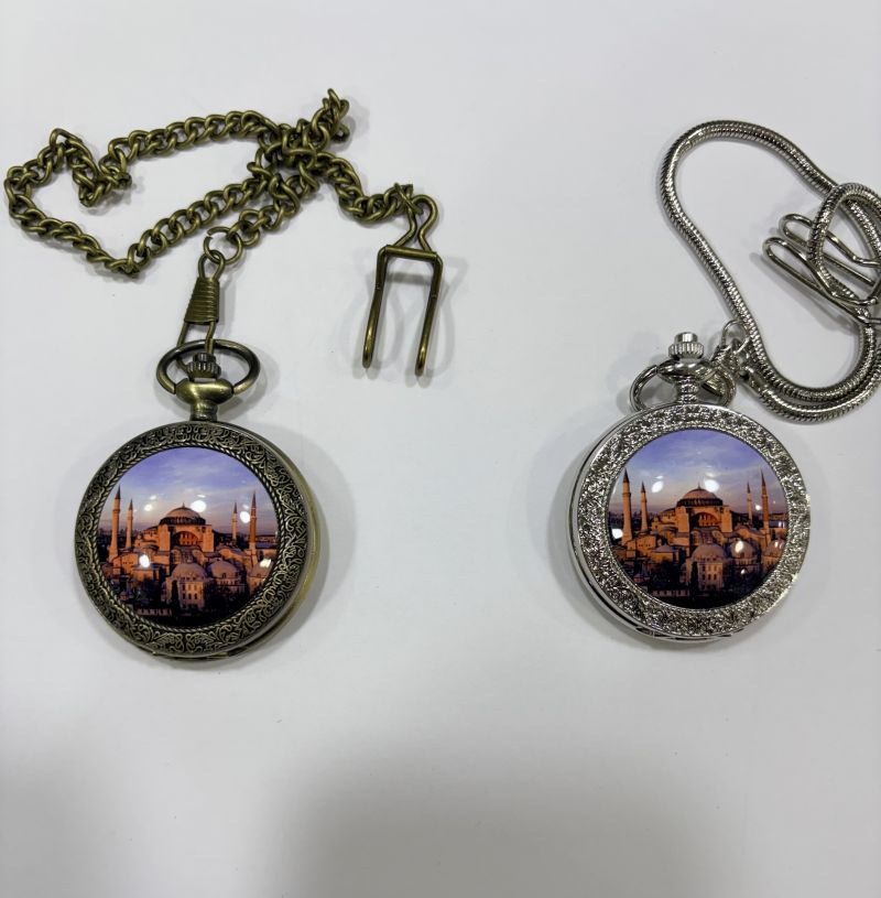 ÖN YÜZ AYASOFYA CAMİİ GÖRSELLİ, ARKA YÜZ DESENSİZ PARLAK LAZER YAZIYA UYGUN KÖSTEKLİ CEP SAATİ